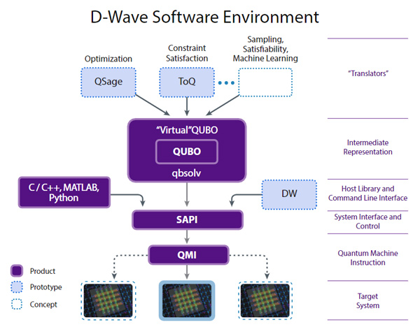 All of these quantum functions, by the way, are controlled by standard computer language code, including C++, Python and MATLAB. The system has its own API, and you can even submit commands to the quantum realm via its “Quantum Machine Instruction” (QMI) commands. As D-Wave explains in its brochure: