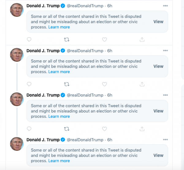 Social media companies were doing the same thing. Within hours of it being set up Facebook deleted a group protesting the election result, while twitter reduced the President’s timeline to this:
